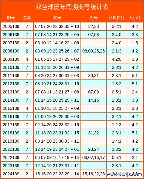 连号分析:积年同时中开出连号的概率为52.63%,客岁同时奖号数据开出连号15,16,22,23,本期算计开出连号14,15,16。